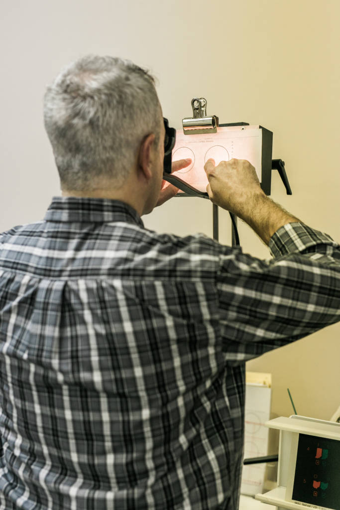 The first step towards determining if you or your child may benefit from vision therapy is a full eye exam by a licensed provider. Developmental optometrists are licensed through the College of Vision Development (COVD.org). These exams go beyond the standard “20/20″ exam in order to find potential problems in how the brain processes information from the eyes, rather than only testing the physical capability of the eyes to see. This can uncover issues that would be missed in most standard vision exams. The comprehensive exam includes close vision acuity, color blindness, how well the eyes team together, how well they make the transition from near to far, tracking and focus, eye movement skills, vision-vestibular integration, gross motor skills, fine motor skills, primitive reflexes, and more.